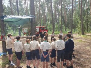 W dniu 22 lipca 2025 r. strażacy z Jednostki Ratowniczo – Gaśniczej KP PSP w Biłgoraju przeprowadzili pogadankę z uczestnikami obozu harcerskiego w miejscowości Smolnik gm. Tereszpol. Spotkanie zostało przeprowadzone w obecności kierownika obozu. Podczas pogadanki z harcerzami poruszono tematykę zagrożeń ze strony różnorodnych zjawisk atmosferycznych oraz prawidłowego zachowania w przypadku ewentualnej ewakuacji obozu. Przedstawione zostały również sposoby udzielania pierwszej pomocy medycznej poszkodowanym. W pogadance uczestniczyło 19 harcerzy oraz 3 opiekunów.
